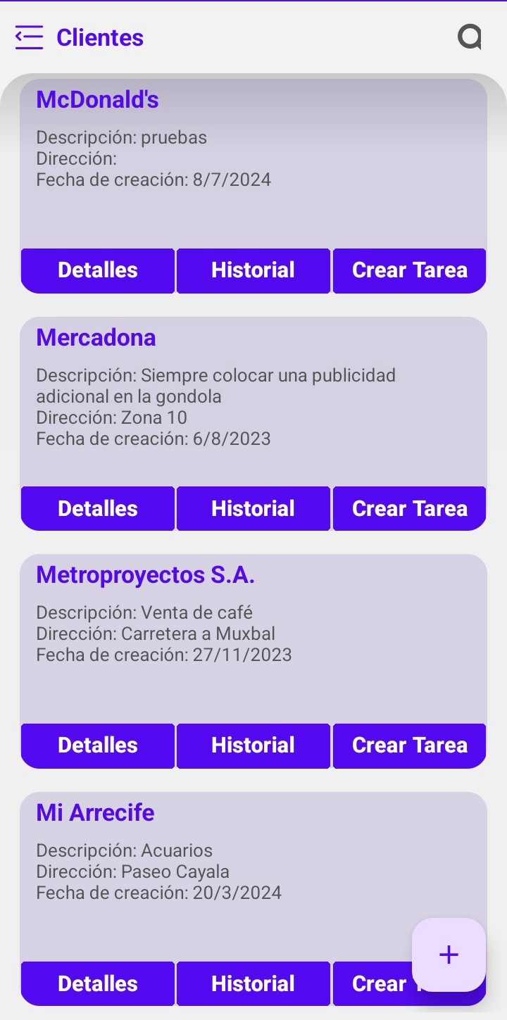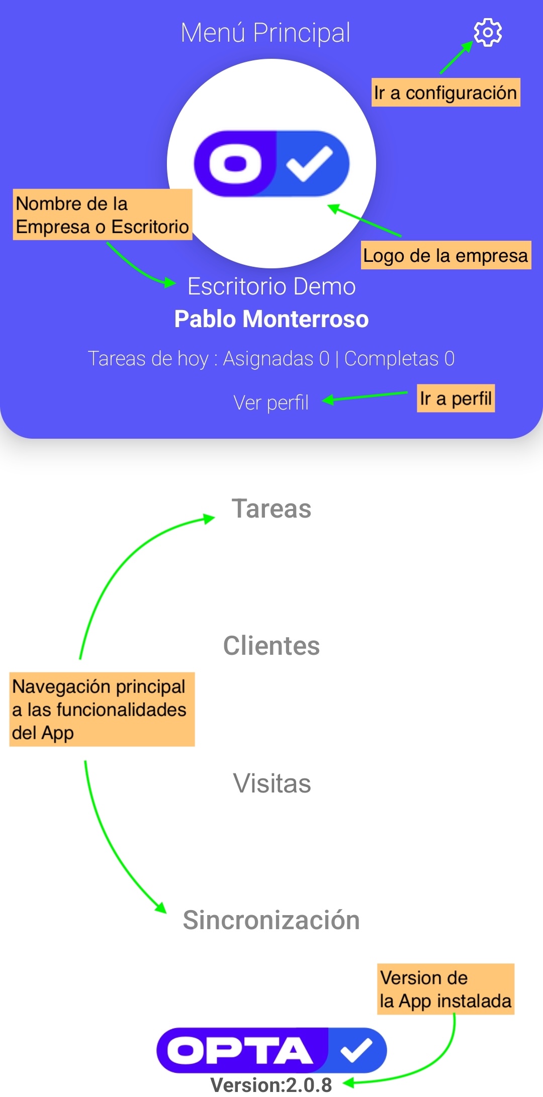 En el Menu Principal puede navegar entre las diferentes funcionalidades, entre ellas: Su perfil, Tareas, Clientes, Etiquetas, Sincronización.