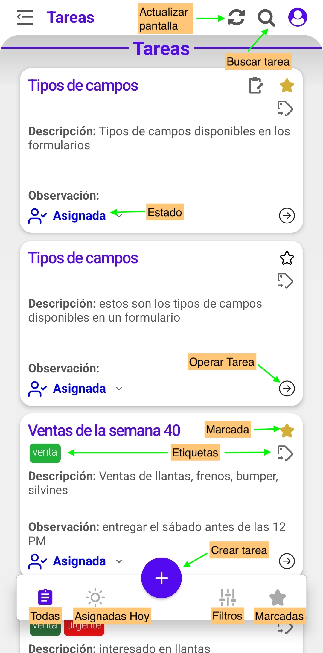 En esa pantalla podrá operar tareas, crear tareas nuevas, aplicar filtros, marcar tareas, buscar tareas.