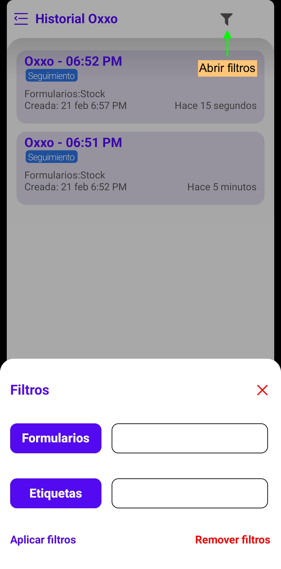También puedes aplicar filtros en este historial de tareas. Puedes filtrar por los formularios usados en las tareas y por etiquetas.