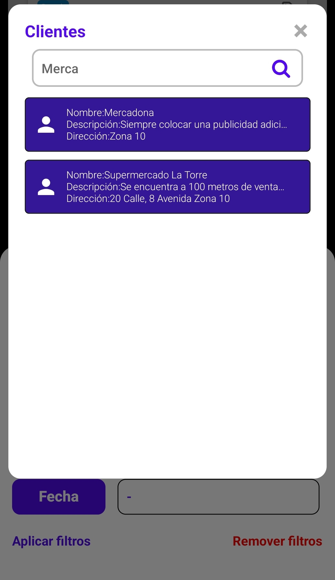 Puede filtrar por cliente, los clientes disponibles son los que tiene asignados a su usuario y equipos donde es miembro, puede hacer uso del buscador para encontrar al cliente.