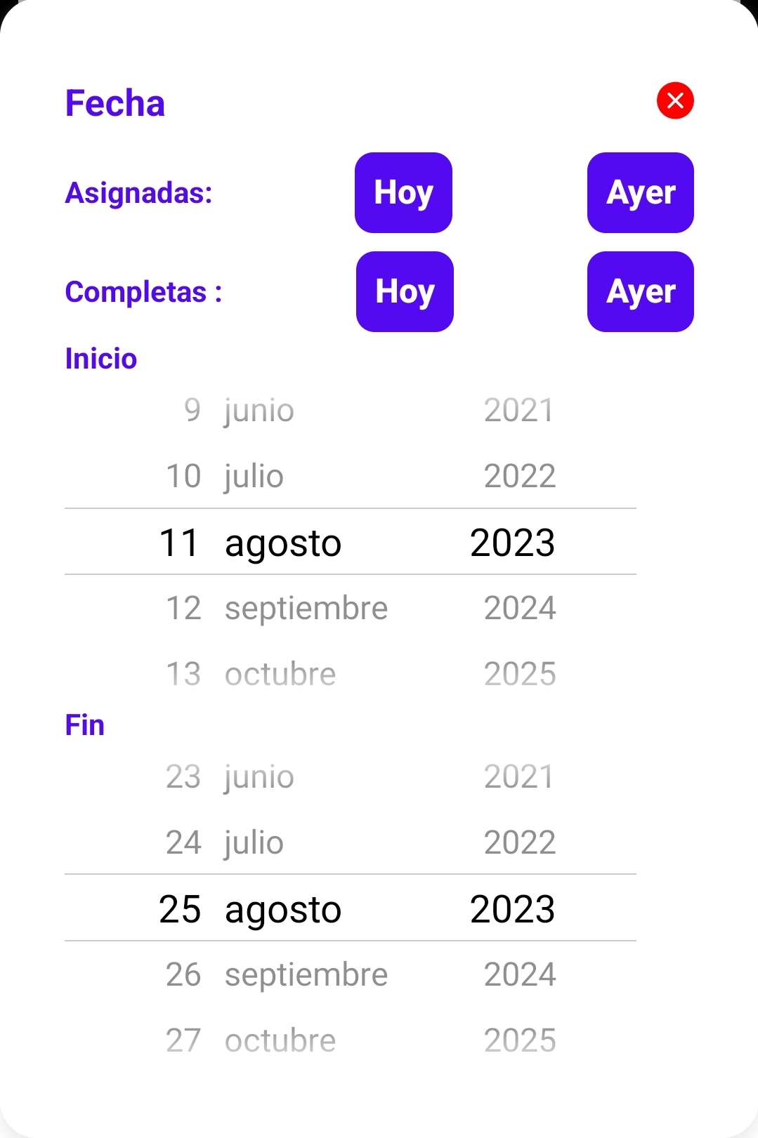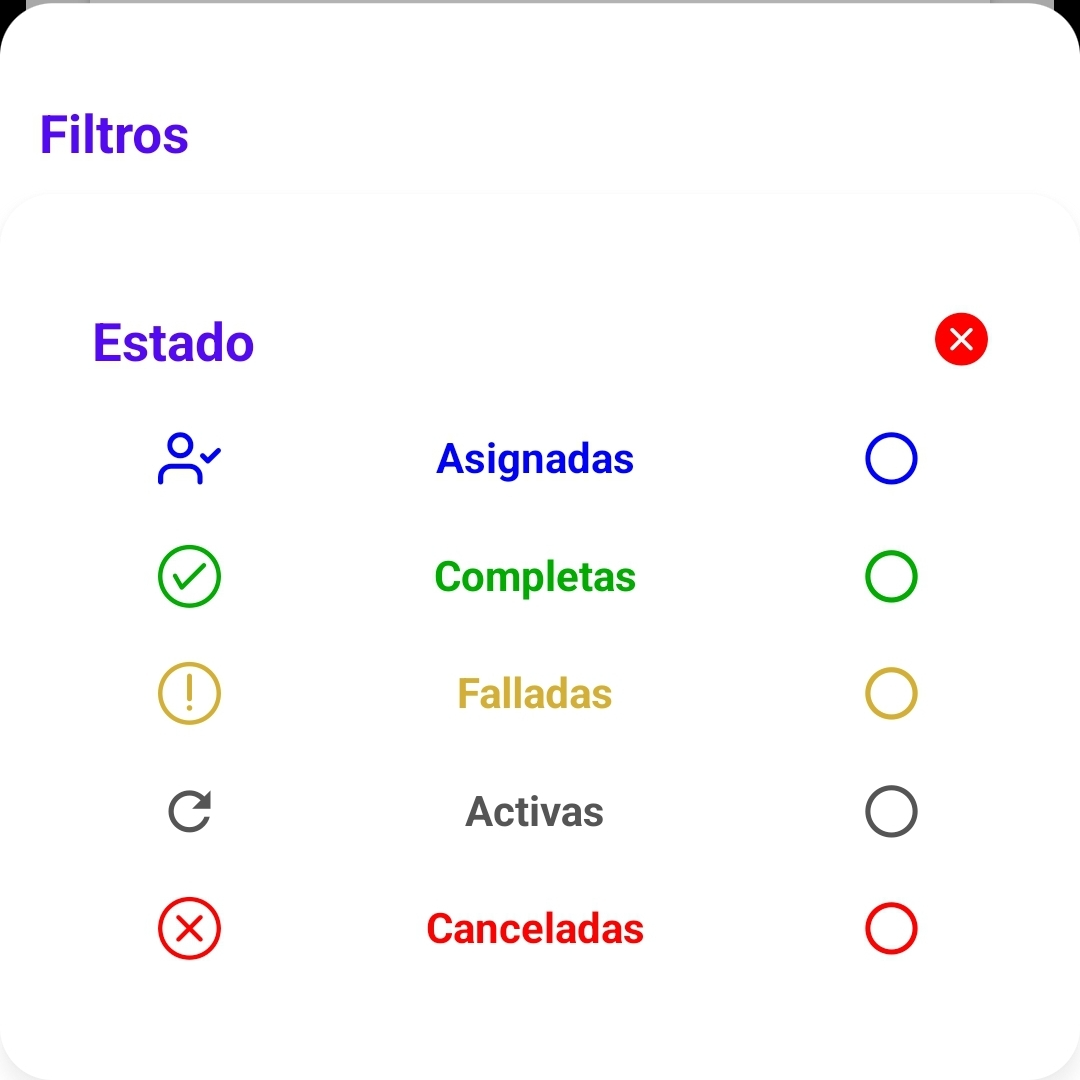 Puede filtrar por estado, los estados disponibles son: Asignada, Completadas, Falladas, Activas, Canceladas.
