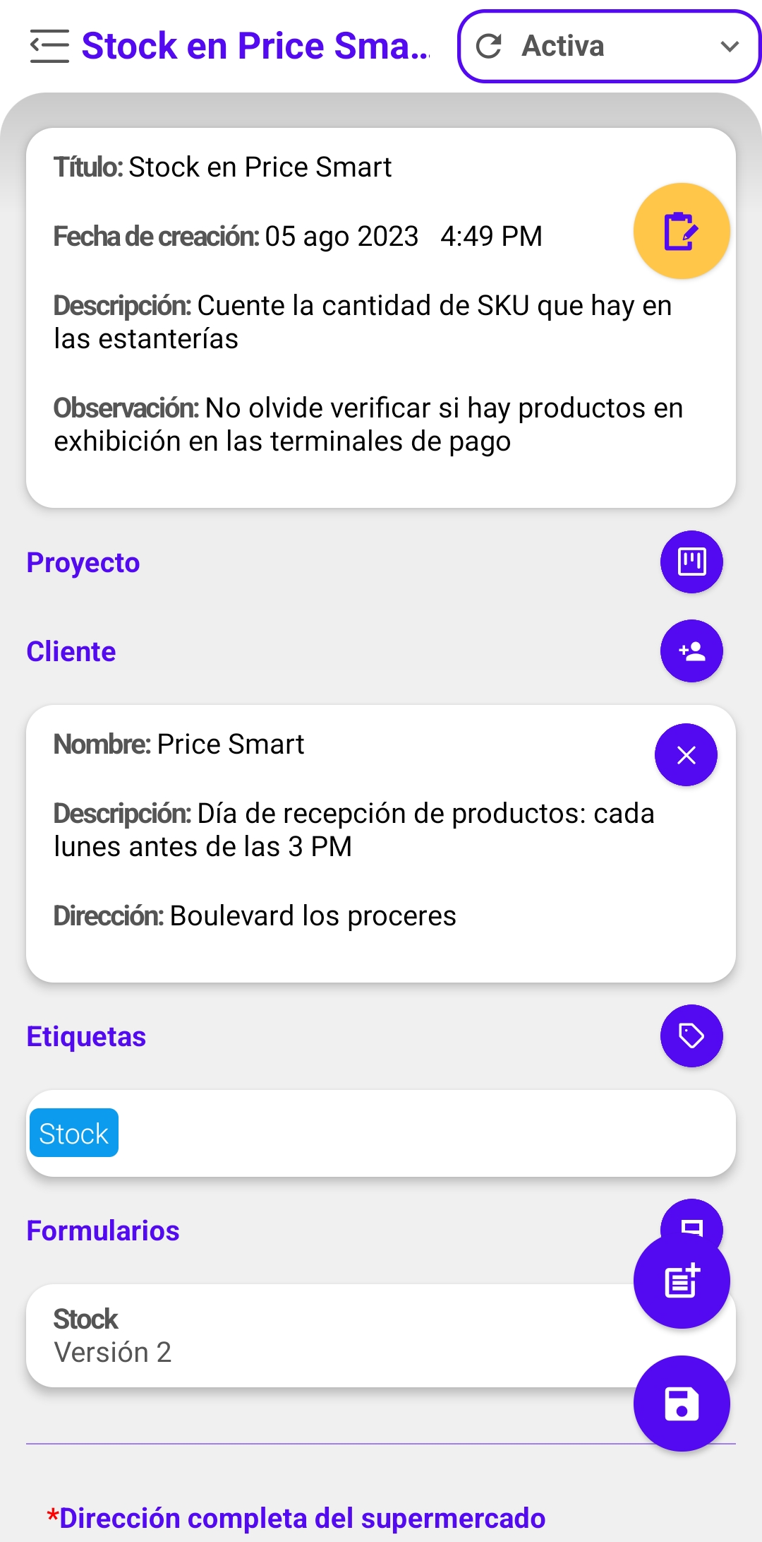 Esto le mostrará el detalle de la tarea donde podrá cambiar el estado, llenar el formulario asignado, agregar más formularios, ver los detalles del cliente, agregar más etiquetas.